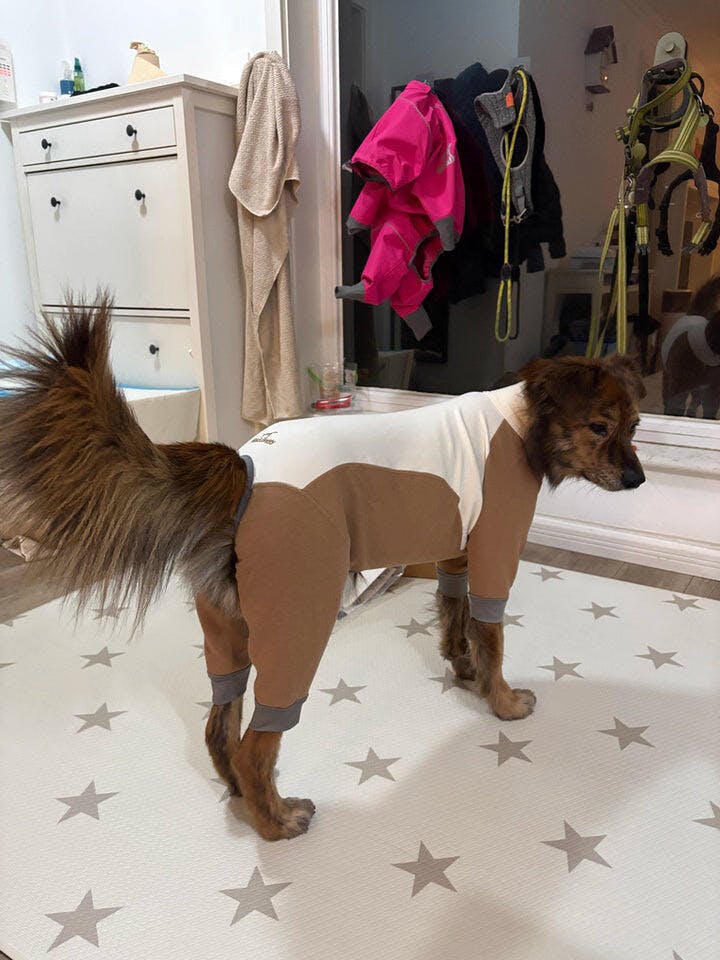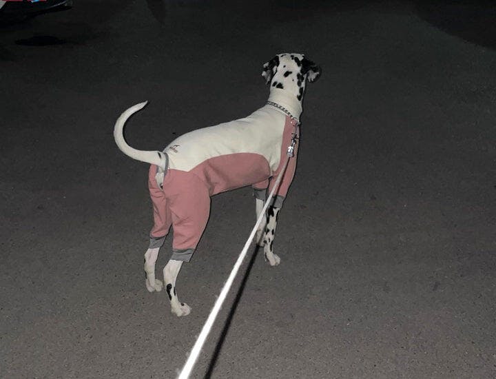 I picked this because of the merino material—it keeps my dog a bit warm, though I wish the merino content was higher. This was our pup’s first onesie for going out. Overall, it fits nicely with a little room to move, and my dog seems totally comfortable.
